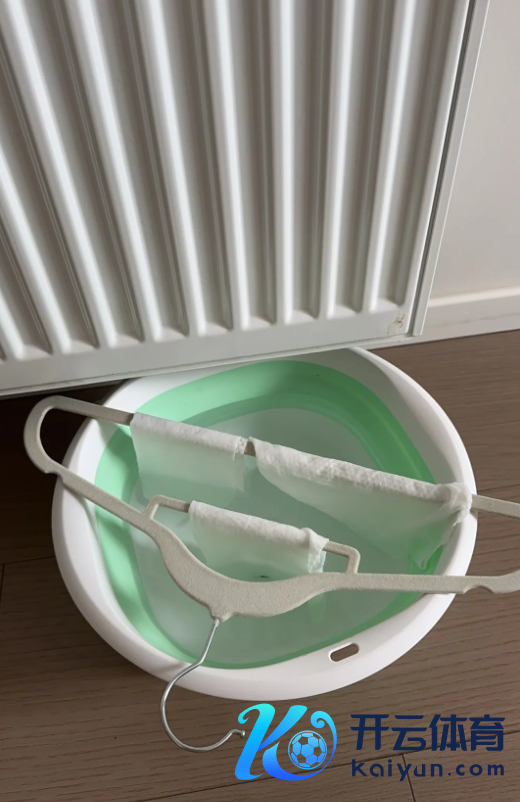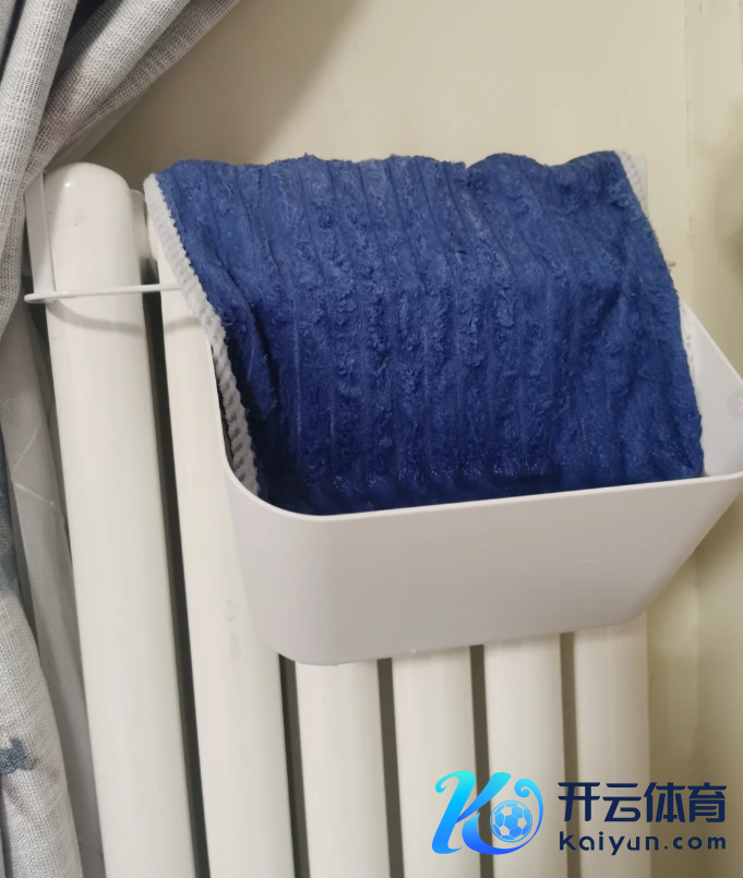 告成在暖气片上放上一个收纳筐,装进去一半“白皙水”,然后把一张干净的湿巾搭上去(一半浸在水里,一半露在外面)。