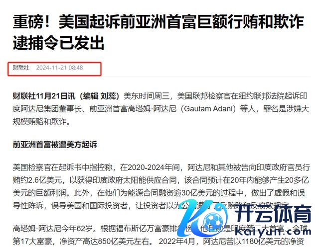 好意思国技艺11月21日,好意思国联邦检讨官在纽约联邦法院以涉嫌大限度贿赂和诓骗的罪名将包括阿达尼在内的阿达尼集团高层发起了诉讼。