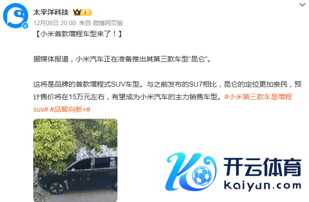 是以商场伏击探访起了小米第三辆车的音讯,有媒体报说念,小米第三款车型是一款增程式SUV,里面代号为“昆仑”,定位于家用,瞻望起售价在15万足下,瞻望2026年肃肃上市销售。