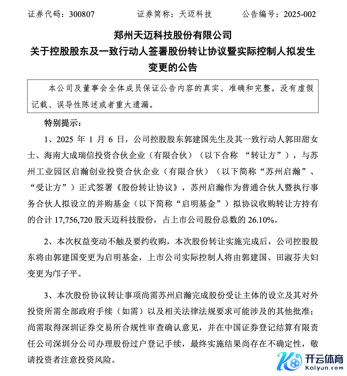 把柄联系公告,联系股份转让本质完成后,天迈科技控股推动将由郭开国变更为启明基金,上市公司本色适度东谈主将由郭开国、田淑芬爱妻变更为启明创投首创足下合资东谈主邝子平。