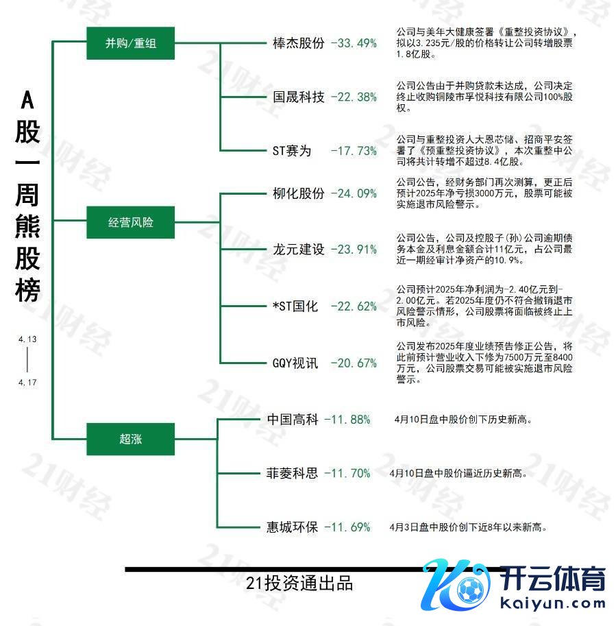 本期十大熊股中(剔除近一周上市的次新股),棒杰股份(002634.SZ)周跌33.49%成为最熊股,柳化股份(600423.SH)、龙元建造(600491.SH)跌幅均在23%以上。本周熊股榜10只个股周跌幅均超17%。