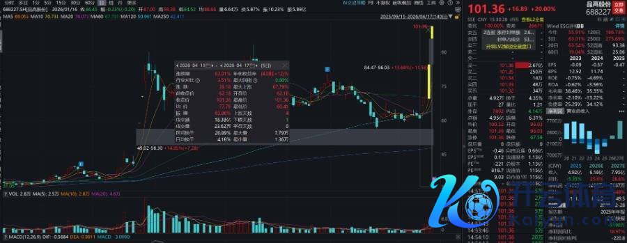 二级市集方面,收尾4月17日收盘,品高股份收货20CM二连板,本周累计涨超63.01%,股价报101.36元/股,总市值115亿元。