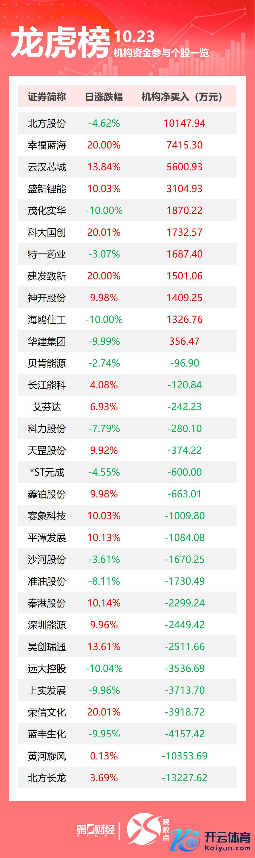 龙虎榜丨机构当天抛售这21股,买入开普云15.08亿元共38只个股出现了机构的身影。